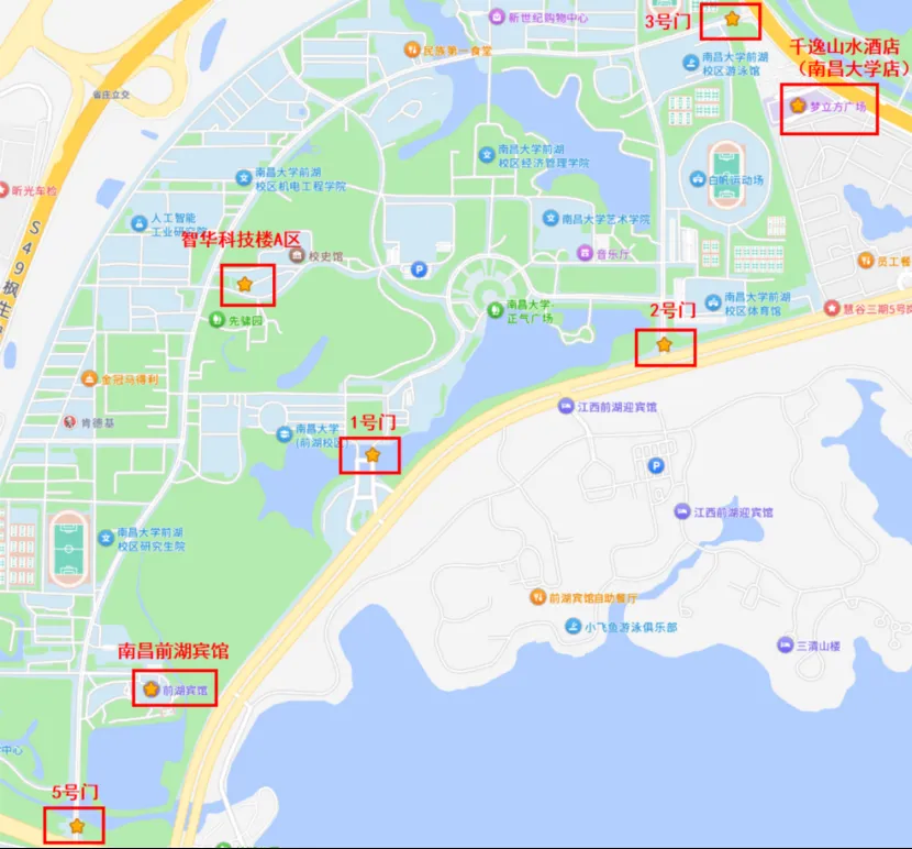 1.驾车入校的参会人员登记并审核通过后,会议当日请统一于"南昌大学前湖校区嘉言路北门(5号门)"通行。